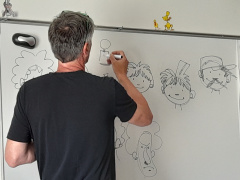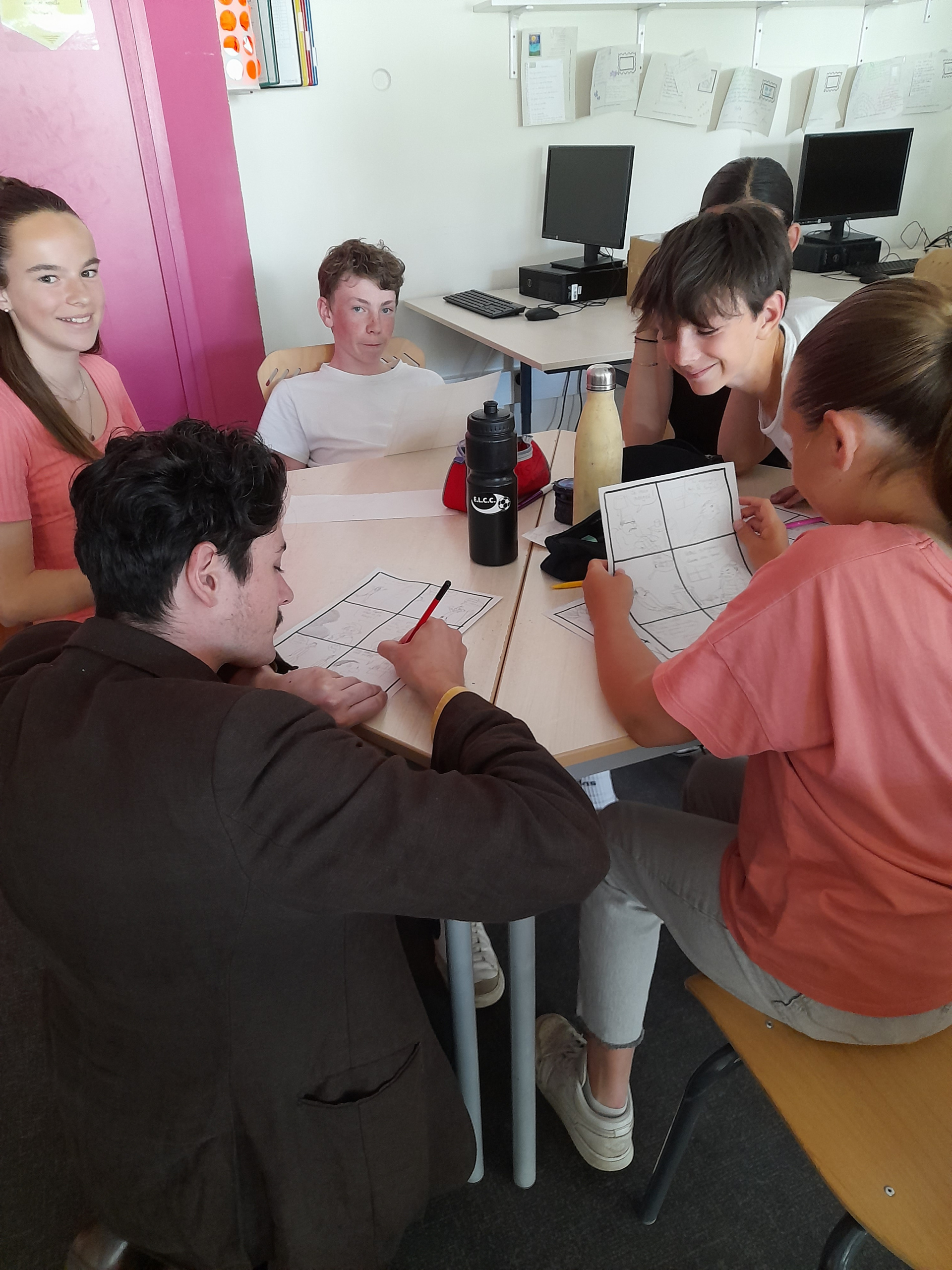 Après s’être présenté (il habite Tinténiac !), Joub a répondu sincèrement et efficacement aux élèves. Il a toujours voulu faire de la BD, « Raconter des histoires en dessin ». Il a commencé par « du bricolage, collage, pliage », puis il a dessiné et enfin il « s’est mis à la BD ». Ses parents voulaient « qu’il s’épanouisse » et ont inscrit leur fiston « à toutes sortes de sports », à la pratique de la musique… Mais pas au dessin !". C’est par ce biais, que Joub « va exprimer sa liberté » ! Bon élève, « ses professeurs le voyaient ingénieur ». Parce qu’« il recopiait très bien les dessins », Joub croyait savoir dessiner. Il avoue qu’« il était revenu au niveau CP », quand il a dessiné sans modèle ! Les élèves ont découvert que dans ses albums, Joub racontait certains événements de sa vie, notamment " les bêtises » qu’il a faites quand il était ado avec ses copains. Il a évoqué son séjour en Guyane et les situations cocasses qu’il a expérimentées, ses rencontres avec « des personnes extraordinaires » (son copain, collectionneur d’animaux morts et secs, a marqué les élèves). Tout ce que l’auteur vit, nourrit son imaginaire. Il le dessine dans ses histoires. Il a réalisé une vingtaine d’albums. Ça fait deux ans, qu’il n’en a pas édité. Il récolte des informations pour une BD qui racontera l’histoire de deux jeunes (un en Guyane, l’autre en France) sur une période de cinq ans. Le monde de la BD est « un monde de rencontres », précise Joub. Comme la BD ne génère pas beaucoup d’argent, « il n’y a pas de concurrence » entre les auteurs. Les festivals offrent des opportunités sympas. Pour que le dessin soit compréhensible, qu’il dise quelque chose au lecteur, l’artiste doit mettre de l’intention. Joub nous offre alors « un cours » de dessin. En deux temps, trois mouvements, sous nos yeux ébahis, des personnages surgissent sur le tableau. D’abord 4 mêmes têtes, puis « il déguise les personnages avec des expressions, des cheveux, des vêtements » : une queue de cheval, un épi sur la tête par-ci, et une moustache par-là et voilà : on a trois personnages de Max et Zoé. Un grand haricot pour la tête, un plus petit pour le nez et hop, Géronimo apparaît sans façon ! Ensuite, « on fait bouger le personnage comme un pantin ». « Un homme qui court tranquille ne se dessine pas de la même façon qu’un homme qui court devant un chien qui veut le mordre ». Cela semble évident et encore plus clair avec « certaines actions qui se voient mieux avec un dessin de profil ». C’est simplement génial et génialement simple ! On est prêt à essayer. Ça tombe bien, car pour la dernière heure, nous nous improvisons dessinateurs de BD sous les regards bienveillants de Joub et de Victor. Par groupe de trois, nous avons, chacun, « petits et grandes », réalisé une planche de BD, avec des consignes données par Joub. On a apprécié cette activité collective et créative. L’expérience était amusante et formatrice. Les dessinateurs se sont révélés et les autres ont fait du mieux qu’ils ont pu. Tout comme Joub qui nous a dit qu’ « il fait du mieux qu’il peut. Et qu’il raconte ce qu’il a envie de dire ». Dessinateur de BD, c’est un métier ! On remercie chaleureusement Joub et Victor d’avoir partagé leur passion pendant ces trois heures qui sont passées très vite.