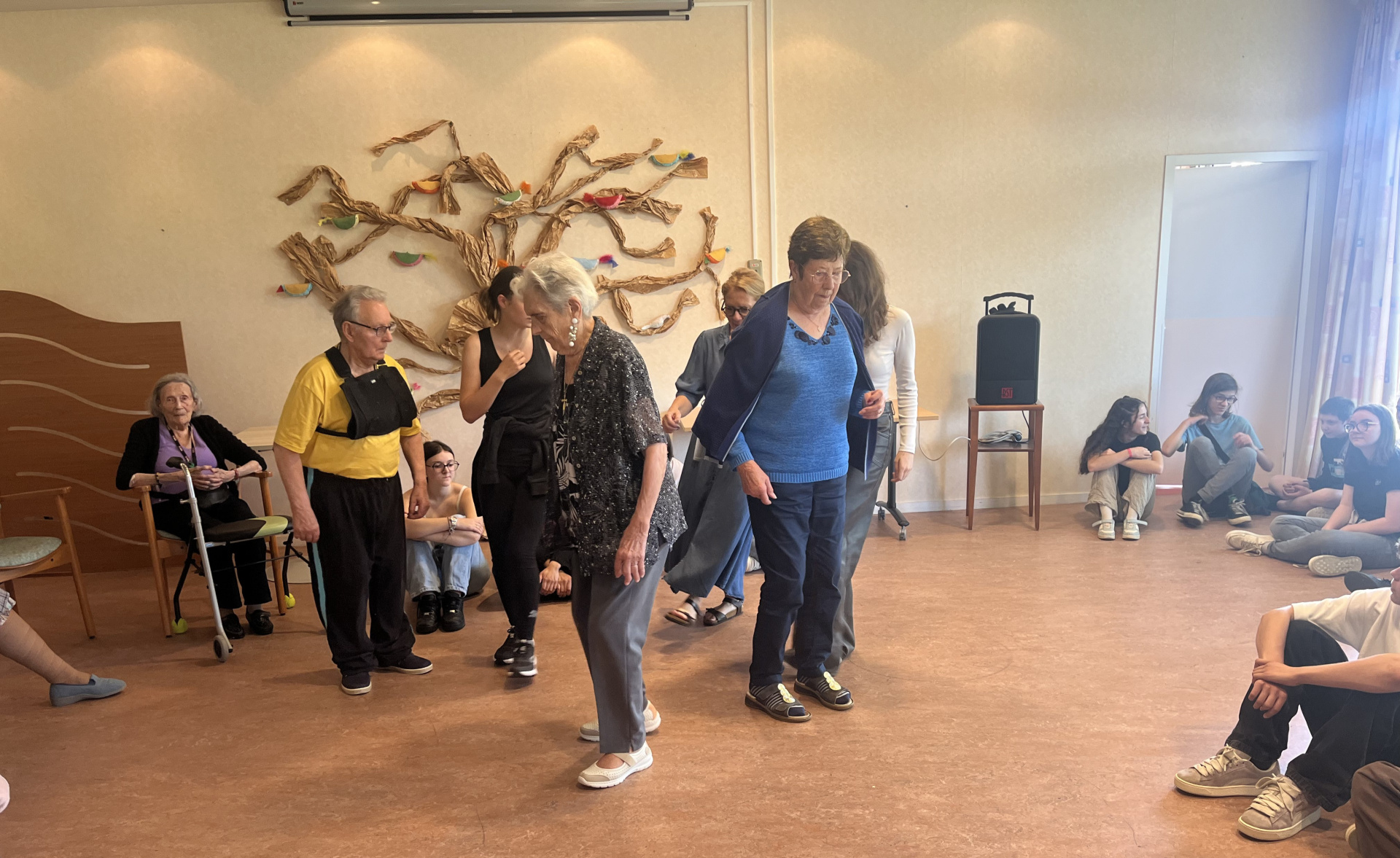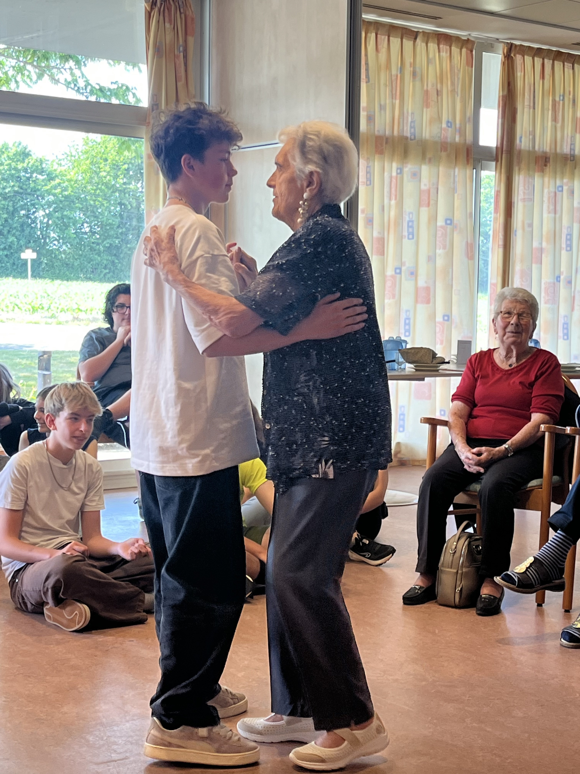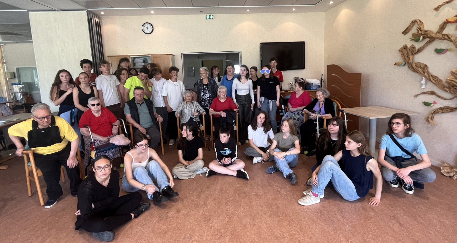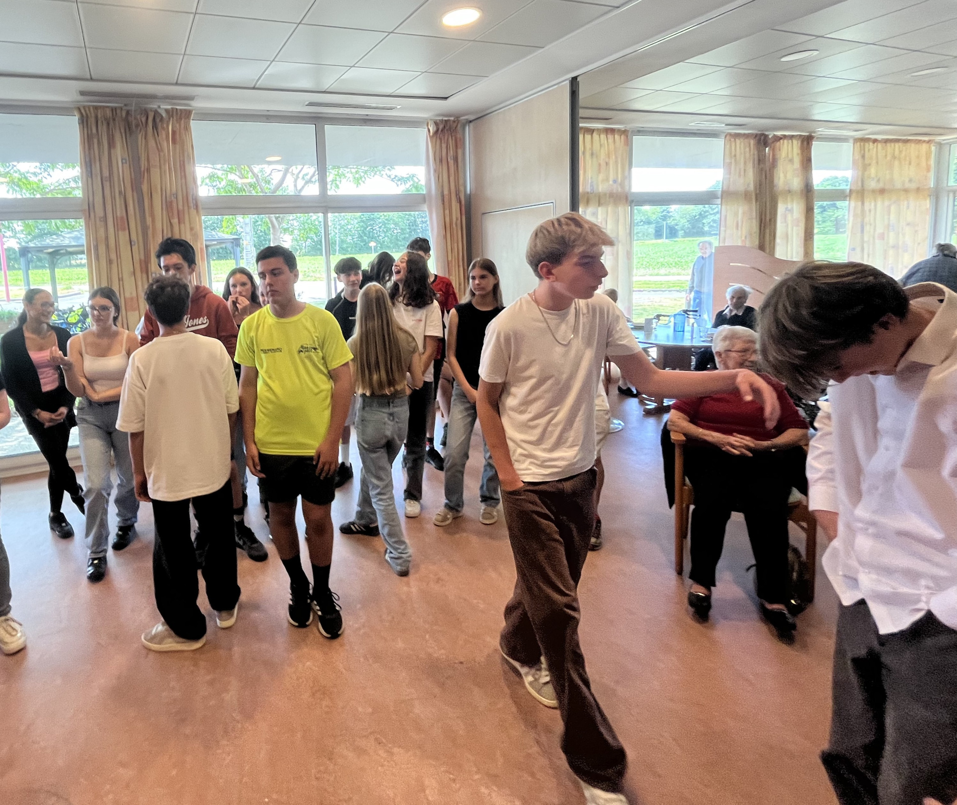 Après une bien belle et bucolique balade sur le halage d’Ille-et-Rance, les élèves ont été accueillis par Carole l’animatrice de l’EHPAD. Ils ont eu droit à une visite guidée des lieux et ainsi rencontré les différents personnels et des résidents prêts à discuter avec les 26 troisièmes présents. Odette leur a même fait visiter sa chambre (super) décorée et évoqué sa famille avec les photos accrochées aux murs. Ensuite les correspondants ont rejoint les ados dans la salle de réception, pour un moment d’échanges. Ils ont parlé de tout, de rien. Chacun répondant aux questions des autres, sans chichi. Il fallait parfois parler fort pour se faire comprendre ! Et finalement petits et grands se sont retrouvés à se trémousser sur différentes musiques. Un bal s’est mis en place tranquillement, commençant par une valse. Un peu timides (et pas du tout sûrs de leurs pieds !) les élèves sont allés invités des résidents. Et les danses se sont enchaînées : valse, marche, madison, macaréna… Carole, qui faisait office de DJ a laissé la place aux musiques des « djeunes » et tout le monde s’est retrouvé sur le « dance floor » improvisé. Et puis, il a fallu terminé la fête. Le déjeuner allait être servi et les troisièmes avaient (aussi, évidemment !) faim ! Avant de se quitter, Odette, Maria, Joseph et les copains ont chaleureusement invité les collégiens à repasser les voir. Et Odette a proposé de danser le tango la prochaine fois !